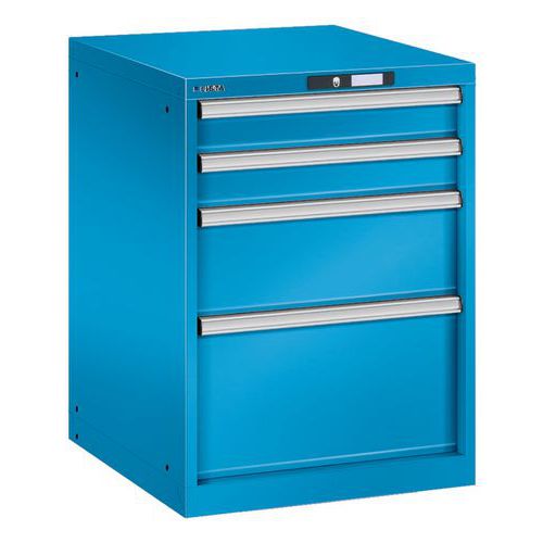 Grote stabiliteit van het geheel met een draagvermogen tot 4 t, laden met een draagvermogen tot 75 of 200 kg Optimaal gebruik dankzij de totale uitbreiding en de optimale hoogte aan de voorzijde van de laden Uitstekende bescherming tegen stof, vloeistoffen en mechanische slijtage dankzij een gesloten geheel met een oppervlak dat bestand is tegen schokken en slijtage Onfeilbare veiligheid met anti-losmaaksysteem dat voorkomt dat de lade eruit valt en met individuele ladeblokkering (antikantelbeveiliging) Bescherming tegen corrosie dankzij een elektrostatische dompellak en spuitlak Optimale opbergmogelijkheden en organisatie dankzij het materiaal voor indeling van LISTA, geschikt voor elke toepassing en dankzij de laden die zijn voorzien van uitsparingen en perforaties Professionele etikettering met de etiketteersoftware van LISTA Script en de inklapbare grijpstang voor de invoering van etiketten Perfect stille verplaatsing dankzij de rail zonder verbindingsstuk