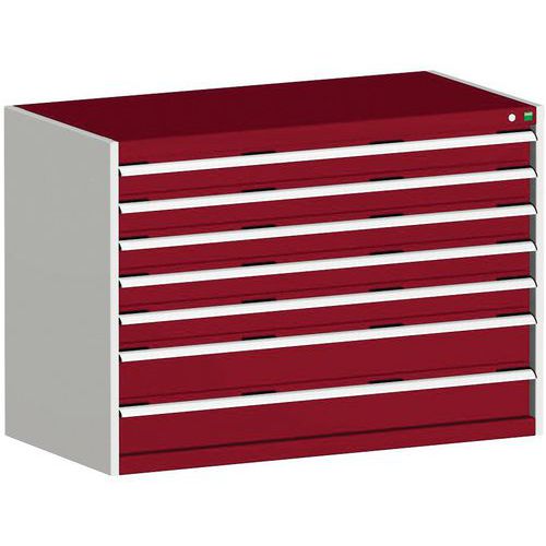 Ergonomische handgrepen die de doorgang van de hand van boven of onder mogelijk maken, ladeblokkeringssysteem standaard, individuele vergrendeling van laden als optie verkrijgbaar.