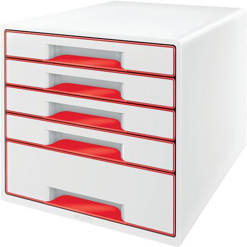 Past bij andere producten uit het WOW-assortiment, voor een perfect ingericht kantoor of thuiskantoor. 2 grote laden voor algemene voorwerpen zoals kabels, tijdschriften of zelfs keukenbenodigdheden en 2 kleine laden voor documenten of kantoorbenodigdheden. Laden met geavanceerd glijsysteem en aanslagen die voorkomen dat de lade eruit valt. Uniek sluitsysteem: eenmaal drukken en de lade blijft gesloten. Geleverd met een transparante opbergtray voor het veilig opbergen van kleine bureau-artikelen zoals pennen, paperclips, etc. Discreet gesloten laden met modern design en ergonomische uitsparing om de lade makkelijk te openen. Slipvaste rubberen beschermvoeten, stapelbaar tot 3 hoog voor ruimtebesparing. Via een gat in de bodem van de kleine laden kunnen documenten makkelijk worden opgetild en naar buiten worden getrokken. Ontwerp en print online jouw eigen labels op www.leitz-easyprint.com.