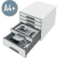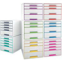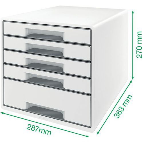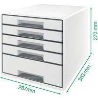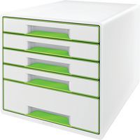 Past bij andere producten uit het WOW-assortiment, voor een perfect ingericht kantoor of thuiskantoor. 2 grote laden voor algemene voorwerpen zoals kabels, tijdschriften of zelfs keukenbenodigdheden en 2 kleine laden voor documenten of kantoorbenodigdheden. Laden met geavanceerd glijsysteem en aanslagen die voorkomen dat de lade eruit valt. Uniek sluitsysteem: eenmaal drukken en de lade blijft gesloten. Geleverd met een transparante opbergtray voor het veilig opbergen van kleine bureau-artikelen zoals pennen, paperclips, etc. Discreet gesloten laden met modern design en ergonomische uitsparing om de lade makkelijk te openen. Slipvaste rubberen beschermvoeten, stapelbaar tot 3 hoog voor ruimtebesparing. Via een gat in de bodem van de kleine laden kunnen documenten makkelijk worden opgetild en naar buiten worden getrokken. Ontwerp en print online jouw eigen labels op www.leitz-easyprint.com.