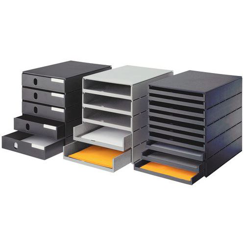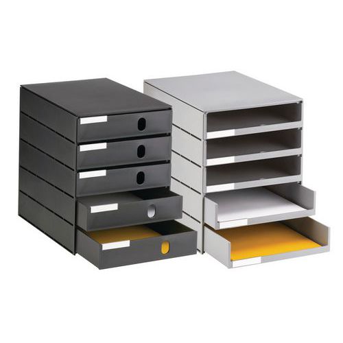 Duurzame opbergmodule met 5 laden Styroval Pro Eco met geringe buitenafmetingen (243 mm breed). Geschikt voor kasten en legplanken. Leverbaar met schuifladen, open of goed afgesloten, voor het opbergen van documenten tot C4-formaat. Styroval Pro Eco is een opbergsysteem waarvan de buitenafmetingen slechts weinig groter zijn dan het binnenvolume van de laden. Het maakt optimaal gebruik van de beschikbare ruimte Styroval is onmisbaar overal waar ruimte schaars is.