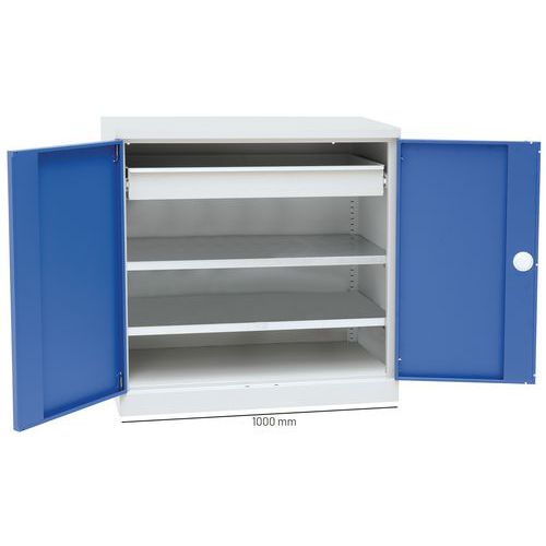 | Productnaam | Lage kast met legborden en schuifladen, Max. belasting: 120 kg, Materiaal: Staal, Totale hoogte: 1000 mm |