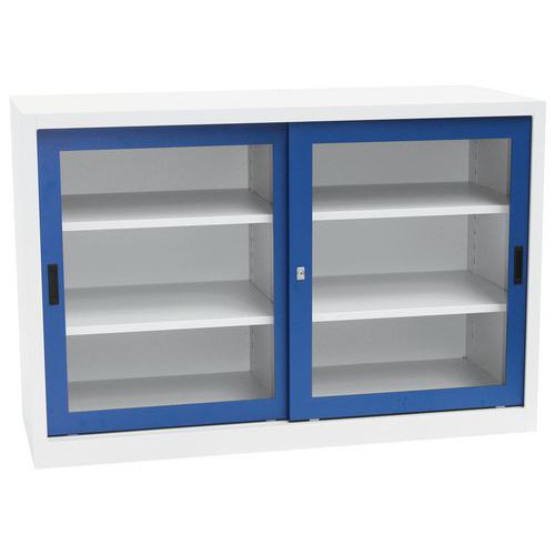 Lage atelierkast van staal (9 mm dik). Vitrine van gehard glas. Met dubbele schuifdeuren om ruimte te besparen. Bepaal zelf de hoogte van uw legborden. Veilig afsluitbaar met een slot. Snel de inhoud zien door de doorzichtige deuren. Veiligheidstips: - Plaats het meubel op een vlak oppervlak - Bevestig het aan de muur of een scheidingswand met een speciale bevestiging - Let erop dat u de aanbevolen maximale belasting niet overschrijdt en zorg voor een goede verdeling Max. belasting (kg) : 250 Klantgarantie : 10 jaar Max. belasting per legbord (kg) : 125