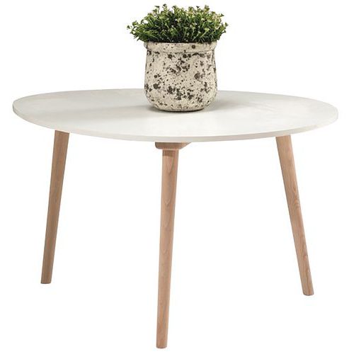 Lage tafel, ideaal in ontvangstruimtes. Gelamineerd blad met een dikte van 7 mm. 3 buisvormige poten van massief beuken. Nylon pad, krasbestendig, diameter 11 mm.