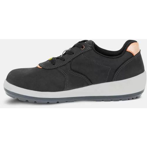 Lage veiligheidsschoenen voor dames. Speciaal ontworpen voor werknemers in de logistieke sector, handel en industrie. Deze veiligheidsschoenen verbeteren uw houding in uw dagelijks werk dankzij de sleehakken van 3 cm en de Parade Air System-technologie. Ze zijn speciaal ontwikkeld voor dames die werkzaam zijn in de distributie, industrie of de logistiek. Stijlvol ontwerp van kalfsleer met fluwelen afwerking en irserende details.