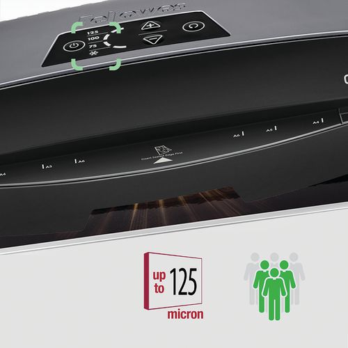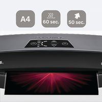 Binnen 60 seconden klaar om te lamineren dankzij de InstaHeat-technologie. Lamineert documenten tot A3-formaat van 80 tot 125 micron. Maximale lamineersnelheid van 50 seconden voor een hoesje van 80 micron. Automatisch omkeersysteem dat de hoes opnieuw uitlijnt in geval van verkeerde plaatsing of papierstoringen. Schakelt automatisch over naar stand-by na 30 minuten inactiviteit.