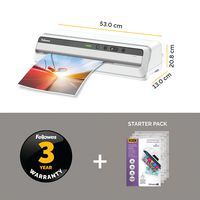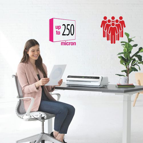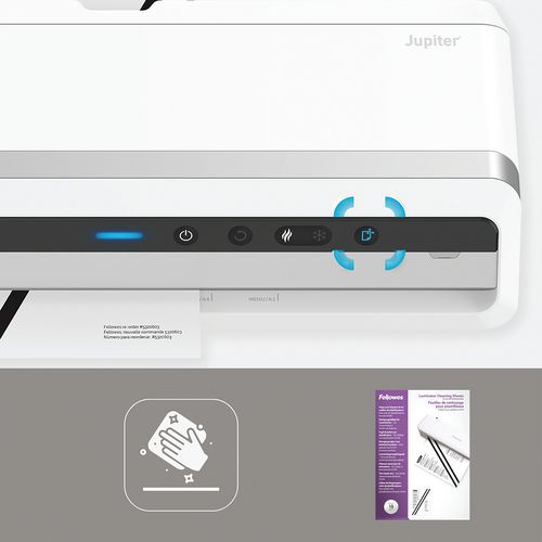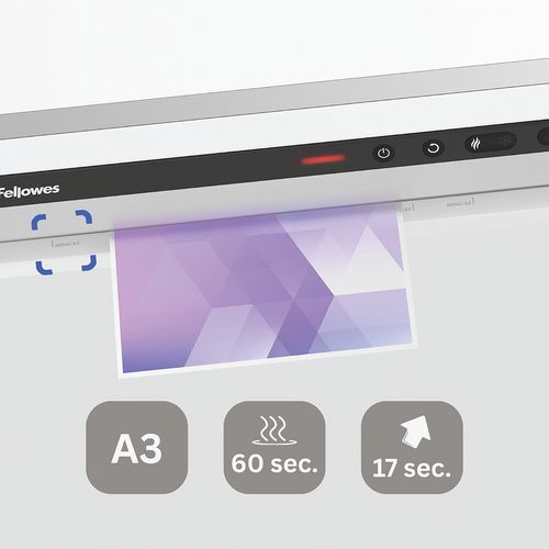 Binnen 60 seconden klaar om te lamineren dankzij de InstaHeat-technologie. Lamineert een A4-hoesje in 17 seconden (1400 mm/min). Uitgerust met 6 rollen voor een superieure lamineerkwaliteit. Geschikt voor alle hoesjes tot A3-formaat en tot 250 micron. Geavanceerd volgsysteem voor hoesjes met lichtgeleider en automatische terugloop voor productieve prestaties zonder storingen. AutoSense-technologie: detecteert de dikte van het hoesje en past de instellingen van de lamineermachine automatisch aan. Reinigingswaarschuwing voor constante resultaten van hoge kwaliteit en een optimale laminering. Schakelt automatisch over naar stand-by na 30 minuten inactiviteit.