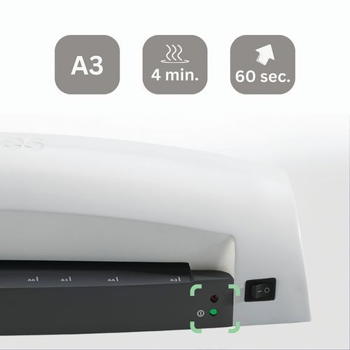 Lamineert documenten en foto's van 80 en 125 micron. Binnen 4 minuten gereed om te lamineren. Ontkoppelingshendel voor het geval van onjuiste invoer of om documenten opnieuw uit te lijnen. Maximale lamineersnelheid van 30 cm/minuut.