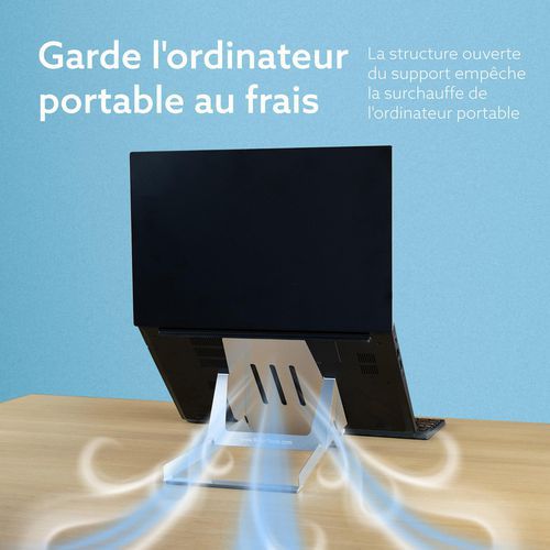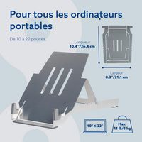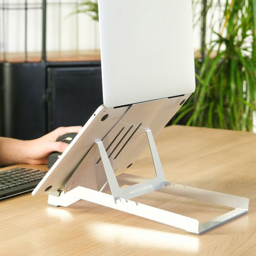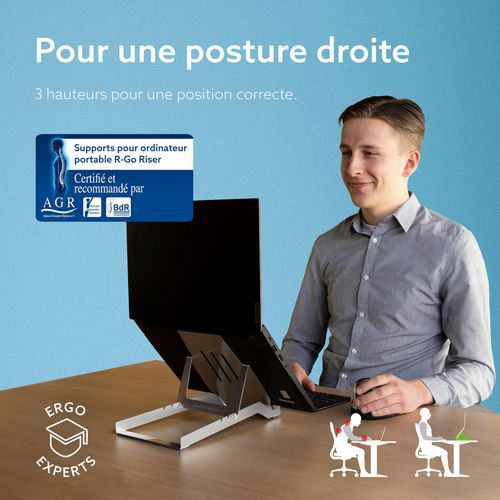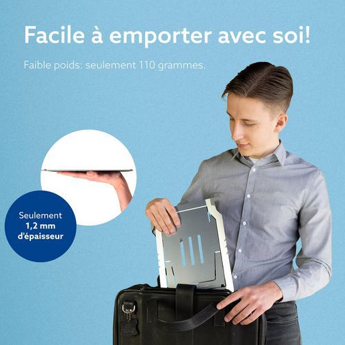 Laptopsteun R-Go Riser Basic, voor het eenvoudig verhogen van het scherm van een laptop naar ooghoogte. Ideaal voor een natuurlijke positie en een verminderde spanning in de nek- en schouderspieren. Met 3-traps hoogteverstelling. Gemaakt van hoogwaardig aluminium van composietmateriaal Hylite 3A, belastbaar tot 5 kg. Fijn, opvouwbaar en licht, ideaal om mee te nemen in uw tas. Universele laptophouder, geschikt voor alle laptops van 10 t/m 22 inch.