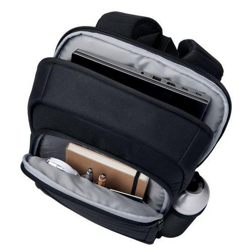 Laptoprugzak EQ, voor laptops van 14 en 16. Met gewatteerde schouderbanden en rug, voor comfortabel steunen op uw rug, nek en schouders. Beschikt over een gewatteerd binnenvak voor elektronica, ruimte voor dossiers en accessoires, en een zijvak voor een waterfles of paraplu. Modern, licht en comfortabel. 2 jaar beperkte garantie.