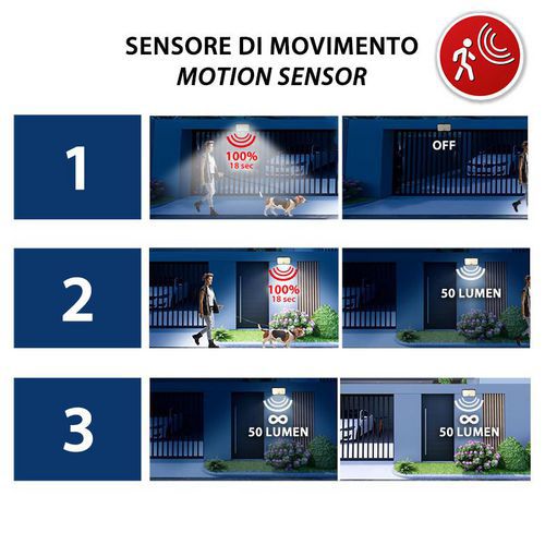 Eenvoudig in gebruik: de spot wordt overdag opgeladen en gaat 's nachts automatisch aan. 3 werkingsstanden: met bewegingssensor, bewegingssensor met tijdelijke of continue verlichting. Multifunctionele buitenlamp: de spot is ontworpen voor buiten.