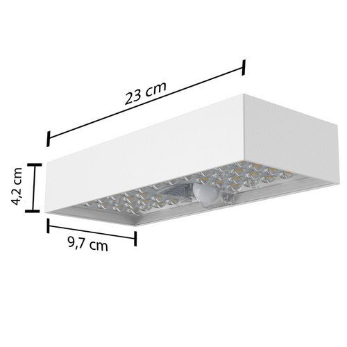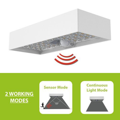 LED wandlamp op zonne-energie van UV-bestendig polycarbonaat en ABS. Eigentijds en zeer verfijnd ontwerp. Schok- en weerbestendig. Het elektronische gedeelte is bijzonder waterbestendig. Werking: de lamp wordt overdag met zonlicht opgeladen. 2 gebruiksmodi: 1) de lamp gaat ‘s avonds automatisch aan en blijft gedurende 5 uur met een lichtsterkte van 50% branden. Daarna (of wanneer de laadtoestand van de batterij minder dan 30% is) gaat de lamp over op de ECO-modus: de lamp gaat automatisch met een lichtsterkte van 100% branden als er beweging wordt gedetecteerd op een afstand van ≤ 6 meter en gaat na 20 seconden zonder beweging weer uit. 2) bewegingsdetectie-modus: de lamp gaat automatisch aan met een lichtsterkte van 100% als er een beweging wordt gedetecteerd binnen een bereik van ≤ 6 meter en gaat na 20 seconden zonder beweging over naar een lichtsterkte van 5%. De lamp heeft de nieuwste generatie SMD-LED, een hoogwaardige diffuser en gelijkmatig licht. Licht 4000 K: niet te warm of