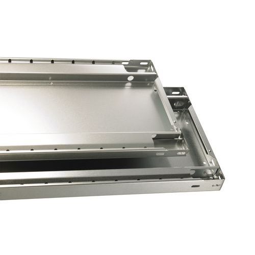 Stevig legbord, gegalvaniseerd of in grijze epoxylak, voor Easy-Fix stelling. Eenvoudige installatie met gemakkelijke plaatsing in de legbordklemmen. Hoge stabiliteit: drie lagen staal in de diepte. Extra versteviging door verdubbeling van het materiaal op de randen voor plaatsing. Om snel een extra etage te maken voor nog meer opslagruimte.