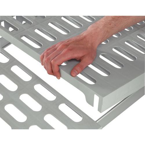 Geperforeerd legbord van zeer bestendig polyethyleen, machine wasbaar voor een perfecte hygiëne. Voedingsmiddelen en kwetsbare producten kunnen rechtstreeks op de legborden worden opgeslagen. Ideale ventilatie van de opgeslagen voorwerpen dankzij de grote perforaties over de gehele lengte.