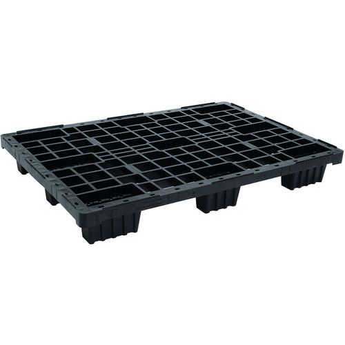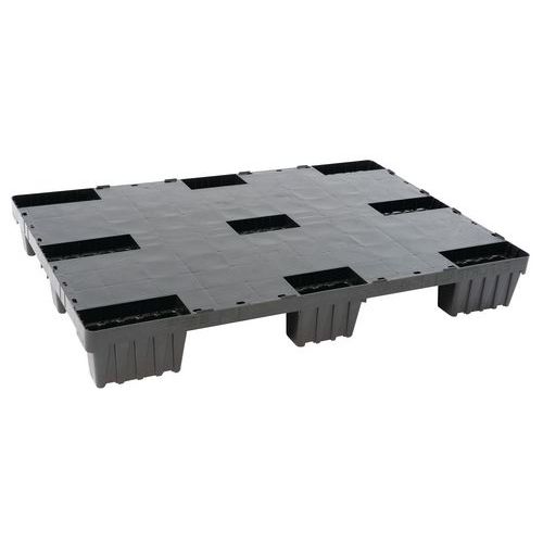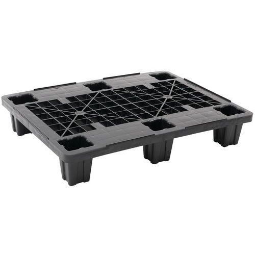 Lichte pallets 800x600 mm, 1200x800 mm en 1200x1000 mm in de kleur zwart met een dicht of open plateau en een onderbroken veiligheidsrand van 5 mm. De pallets zijn licht, robuust en stapelbaar.