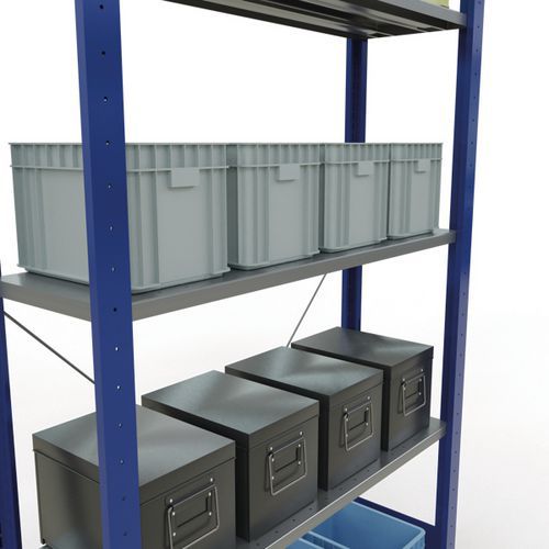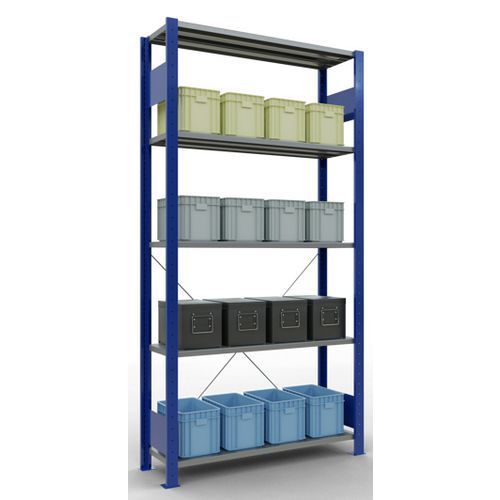 Stellingsysteem, stevig en zeer compleet, met fraaie afwerking met grijze of blauwe epoxylak. Dichte legborden van plaatstaal die producten van verschillende afmetingen kunnen dragen. Industriële stelling, eenvoudig en snel te monteren door in elkaar te schuiven, zonder speciaal gereedschap. Eenvoudig uit te breiden met één of meer aanbouwstelling(en).