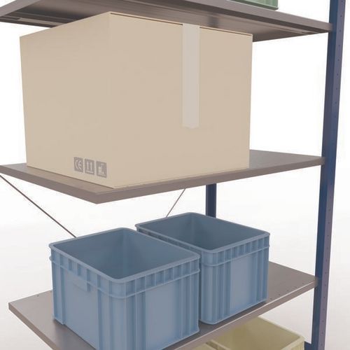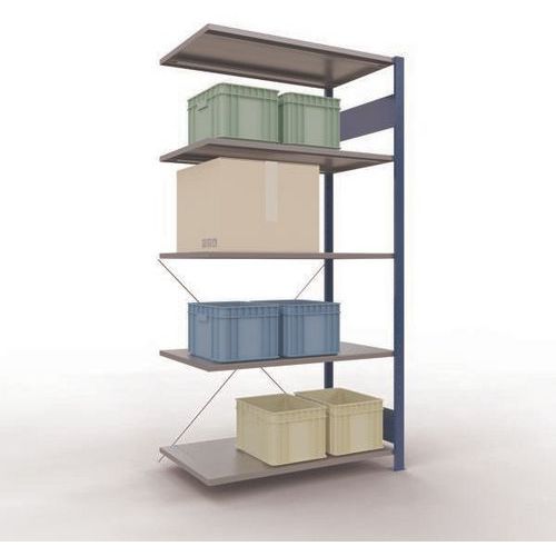 Stellingsysteem, stevig en zeer compleet, met fraaie afwerking met grijze of blauwe epoxylak. Dichte legborden van plaatstaal die producten van verschillende afmetingen kunnen dragen. Industriële stelling, eenvoudig en snel te monteren door in elkaar te schuiven, zonder speciaal gereedschap. Eenvoudig uit te breiden met één of meer aanbouwstelling(en).