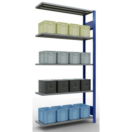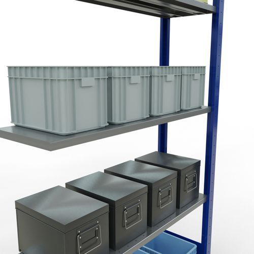 Stellingsysteem, stevig en zeer compleet, met fraaie afwerking met grijze of blauwe epoxylak. Dichte legborden van plaatstaal die producten van verschillende afmetingen kunnen dragen. Industriële stelling, eenvoudig en snel te monteren door in elkaar te schuiven, zonder speciaal gereedschap. Eenvoudig uit te breiden met één of meer aanbouwstelling(en).