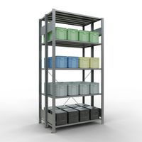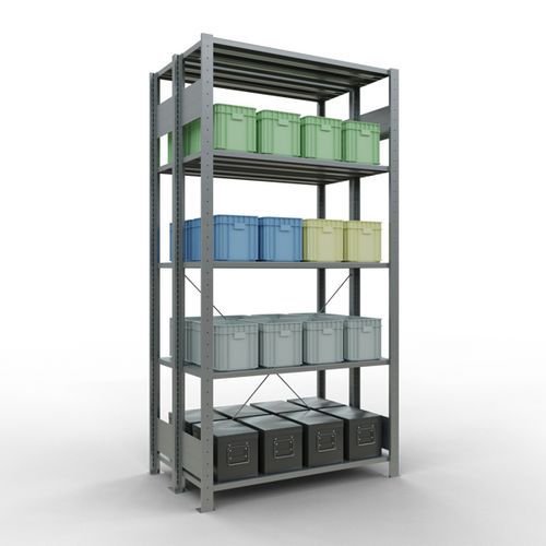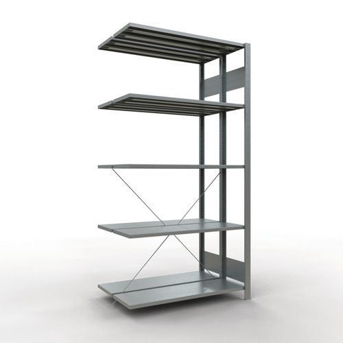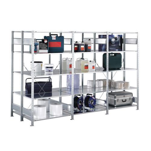Robuuste dubbelzijdige magazijnstelling met gegalvaniseerde afwerking, zeer goed bestand tegen vochtige omgevingen. Dichte legborden van plaatstaal die producten van verschillende afmetingen kunnen dragen. Industriële stelling, eenvoudig en snel te monteren door in elkaar te schuiven, zonder speciaal gereedschap. Eenvoudig uit te breiden met één of meer aanbouwstelling(en). Afstand tussen de perforaties: 5 mm. Hoogte van de eerste perforatie: 22,5 mm.