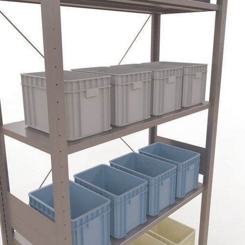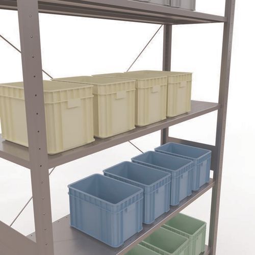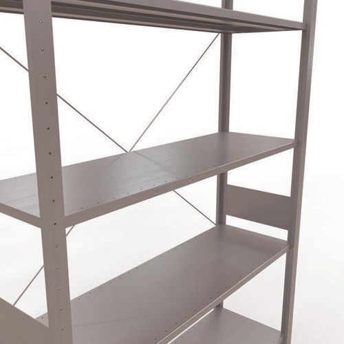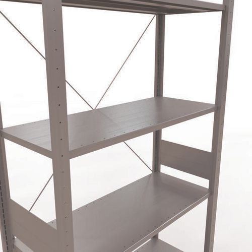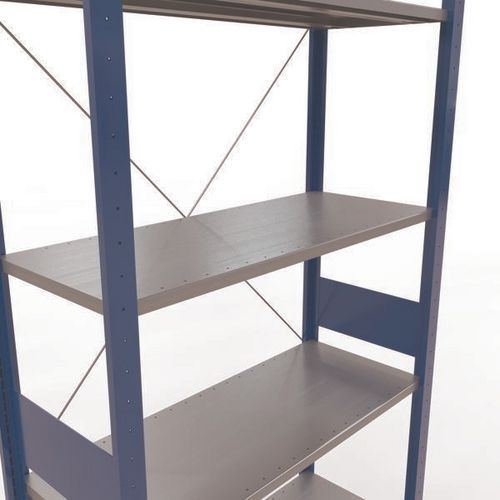 Robuuste magazijnstelling, gegalvaniseerde afwerking, zeer bestand tegen vochtige omgevingen. Dichte legborden van plaatstaal die producten van verschillende afmetingen kunnen dragen. Industriële stelling, eenvoudig en snel te monteren door in elkaar te schuiven, zonder speciaal gereedschap. Eenvoudig uit te breiden met één of meer aanbouwstelling(en). Afstand tussen de perforaties: 25 mm. Hoogte van de eerste perforatie: 50 mm. Hoogte van de eerste perforatie: 22,5 mm.