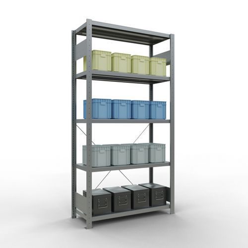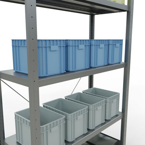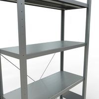 Robuuste magazijnstelling, gegalvaniseerde afwerking, zeer bestand tegen vochtige omgevingen. Dichte legborden van plaatstaal die producten van verschillende afmetingen kunnen dragen. Industriële stelling, eenvoudig en snel te monteren door in elkaar te schuiven, zonder speciaal gereedschap. Eenvoudig uit te breiden met één of meer aanbouwstelling(en). Afstand tussen de perforaties: 25 mm. Hoogte van de eerste perforatie: 50 mm. Hoogte van de eerste perforatie: 22,5 mm.