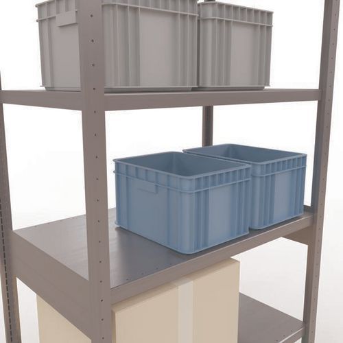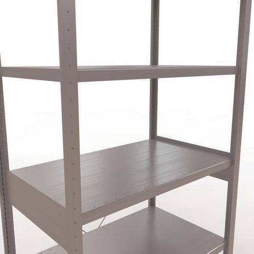 Robuuste magazijnstelling, gegalvaniseerde afwerking, zeer bestand tegen vochtige omgevingen. Dichte legborden van plaatstaal die producten van verschillende afmetingen kunnen dragen. Industriële stelling, eenvoudig en snel te monteren door in elkaar te schuiven, zonder speciaal gereedschap. Eenvoudig uit te breiden met één of meer aanbouwstelling(en). Afstand tussen de perforaties: 25 mm. Hoogte van de eerste perforatie: 50 mm.