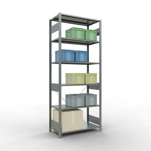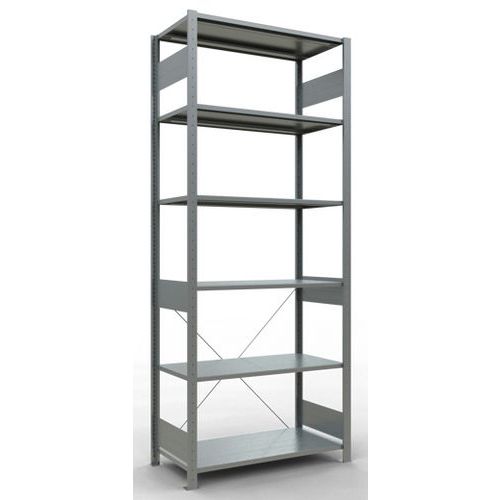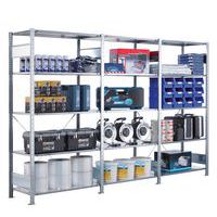 Robuuste magazijnstelling, gegalvaniseerde afwerking, zeer bestand tegen vochtige omgevingen. Dichte legborden van plaatstaal die producten van verschillende afmetingen kunnen dragen. Industriële stelling, eenvoudig en snel te monteren door in elkaar te schuiven, zonder speciaal gereedschap. Eenvoudig uit te breiden met één of meer aanbouwstelling(en). Afstand tussen de perforaties: 25 mm. Hoogte van de eerste perforatie: 50 mm.