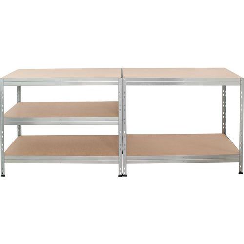 Industriële stelling voor het opslaan van lichte tot middelzware lasten van 250 kg/niveau. Leverbaar in verschillende afmetingen en 3 afwerkingen (epoxylak of verzinkt staal). Robuust: veilige bevestiging van de liggers door middel van dubbele klinknagels, 2 verstevigingen per niveau onder de legborden. Stelling aanpasbaar d.m.v. montage: 1 hoge juk of 2 jukken naast elkaar. Kleur RAL: blauw 5010, antraciet 7016. HDF-spaanplaat, zeer hoge dichtheid. Magazijnlegbord, zeer eenvoudig en zonder specifiek gereedschap te monteren.