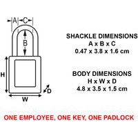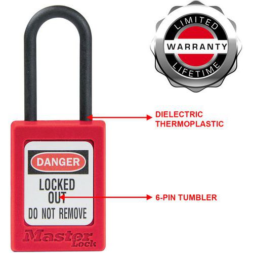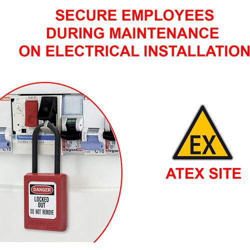 Lockouthangslot van thermoplast en beugel van diëlektrisch nylon, diameter 4,76 mm, voor elektrische installaties. Aangepast voor explosiegevaarlijke locaties en zones (ATEX). Zonder sleutelborging. Fijne beugel voor meer lockouttoepassingen. Denk aan de LIFEGUARD-service: een gratis service voor het registreren van de sleutelnummers die door een bedrijf worden gebruikt om er zeker van te zijn dat er geen dubbele sleutels in uw teams zitten! Geef dit aan bij de bestelling.