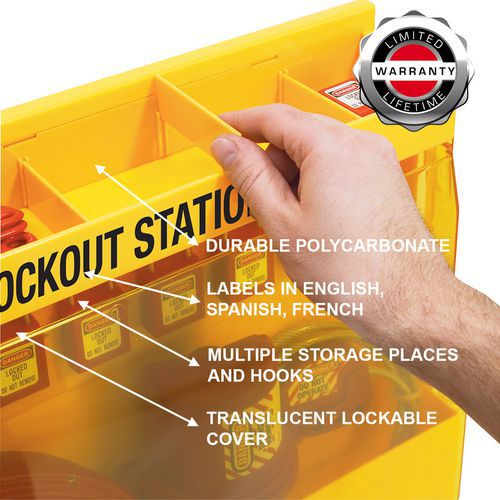 - Compact lockoutstation voor eenvoudige opslag en plaatsing van hangsloten en lockoutaccessoires voor machines in de buurt van een lockoutpunt.