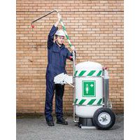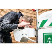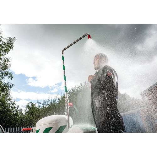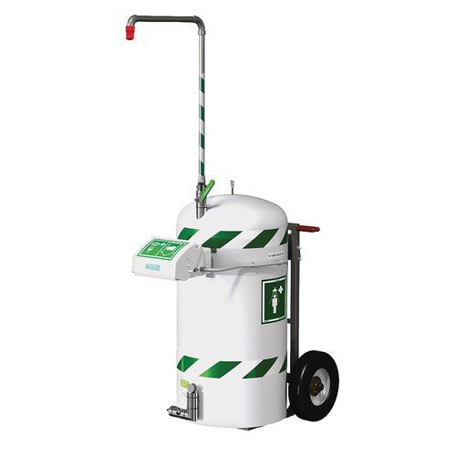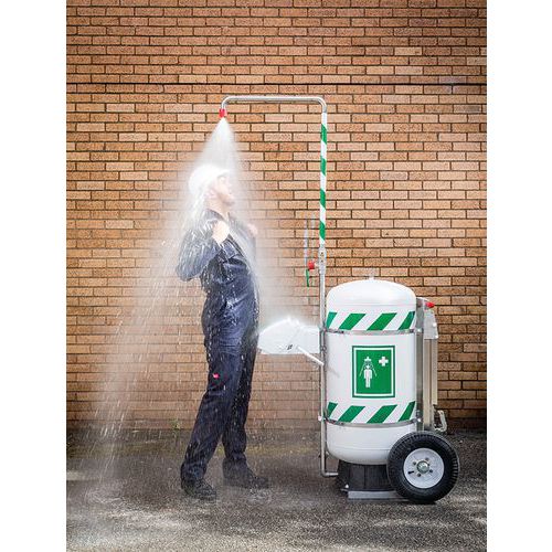 Draagbare, mobiele veiligheidsdouche die autonoom kan functioneren, met een capaciteit van 114 liter en voorzien van een oog- en gezichtswasinstallatie.