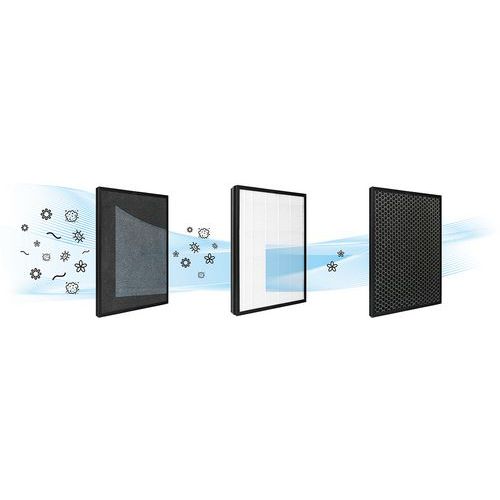 - Drievoudige filtering: voorfilter, HEPA-filter en actieve koolfilter.