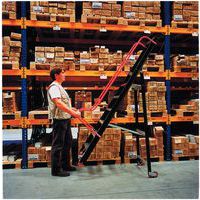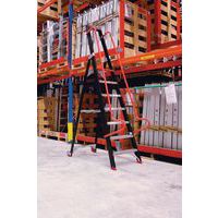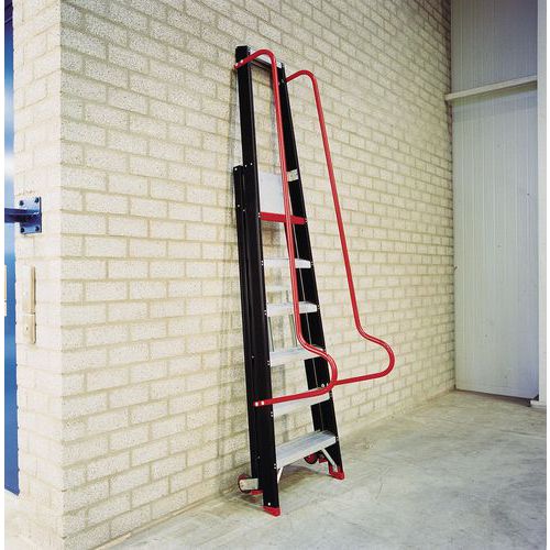 - Magazijntrapladder, eenvoudig te verplaatsen dankzij de vaste wielen aan de achterkant.