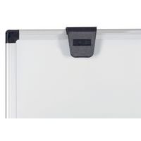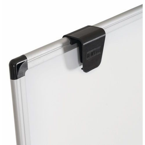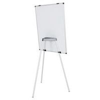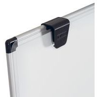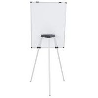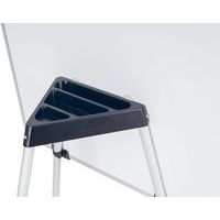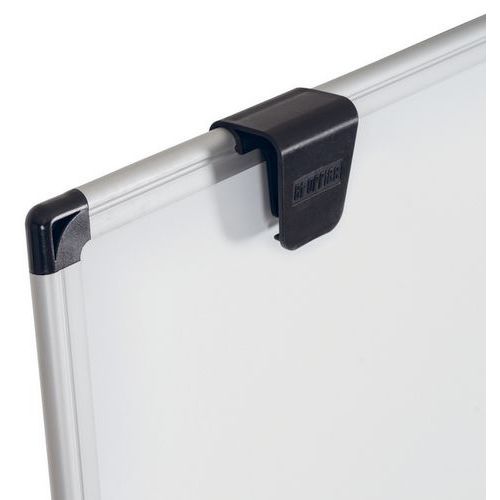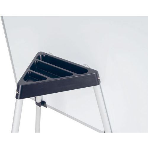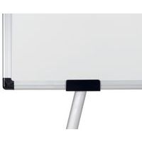 Magnetisch whiteboard 100x70 cm, drie aluminium poten, centrale kunststof basis die tevens fungeert als houder voor het opbergen van accessoires, haken voor papierblokken, montagehandleiding.