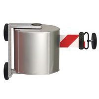 Bandbehuizing met magnetische muurbevestiging. Band wordt opgerold via magnetische muursteun. Kan worden toegepast voor een afbakening in alle richtingen. Ingebouwde rem zodat de band niet te snel terugschiet. Oprollen wordt afgeremd indien de band per ongeluk los gaat.