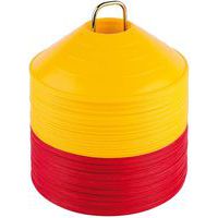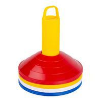 - Extra flexibele en onbreekbare markeerhoedjes (materiaal dat meeplooit en wordt platgedrukt onder de voet van de sporter, waardoor vallen en andere ongelukken worden voorkomen) met een diameter van 20 cm en een hoogte van 5 cm.