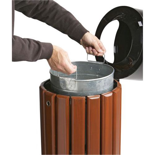 Robuuste Rosa afvalbak, goed bestand tegen corrosie. Past perfect in de omgeving. Vandalismebestendig. Deksel met bevestigingsriem. 2 verkleinde vooropeningen die de invoer van grote of gevaarlijke objecten beperken. Hoofd- en structuurframe van poedergecoat staal, UV-bestendig. Lichaam van verniste houten latten (dikte 20 mm) van kamferhout. Binnenbak van verzinkt staal met 2 handgrepen, gemakkelijk te verwijderen. Driehoekige slot met sleutel. Deksel in kleur voor gescheiden afvalinzameling. Bevestiging op 4 punten. Eenvoudige lediging. Klantgarantie : 10 jaar