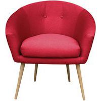 Spaanplaatstructuur, dikte l5 mm Bekleed met 100% polyester stof. Vast zitkussen, polyurethaanschuim, dikte 8 cm, dichtheid 28 kg/m3. B/H/D zitting: 46 x 46 x 46 cm. Hoogte rugleuning 35 cm. B/H/D fauteuil: 76 x 81 x 66 cm. Poten Ø 3 cm in naturel gelakt massief hout. Geleverd met pootjes die gemonteerd moeten worden.