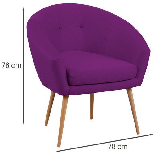 Spaanplaatstructuur, dikte l5 mm Bekleed met 100% polyester stof. Vast zitkussen, polyurethaanschuim, dikte 8 cm, dichtheid 28 kg/m3. B/H/D zitting: 46 x 46 x 46 cm. Hoogte rugleuning 35 cm. B/H/D fauteuil: 76 x 81 x 66 cm. Poten Ø 3 cm in naturel gelakt massief hout. Geleverd met pootjes die gemonteerd moeten worden.
