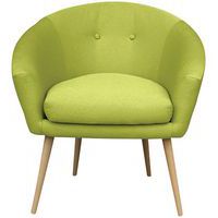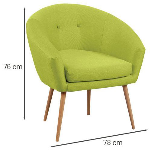 Spaanplaatstructuur, dikte l5 mm Bekleed met 100% polyester stof. Vast zitkussen, polyurethaanschuim, dikte 8 cm, dichtheid 28 kg/m3. B/H/D zitting: 46 x 46 x 46 cm. Hoogte rugleuning 35 cm. B/H/D fauteuil: 76 x 81 x 66 cm. Poten Ø 3 cm in naturel gelakt massief hout. Geleverd met pootjes die gemonteerd moeten worden. Gemaakt in de EU Klantgarantie : 3 jaar