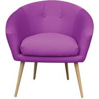 Spaanplaatstructuur, dikte l5 mm Bekleed met 100% polyester stof. Vast zitkussen, polyurethaanschuim, dikte 8 cm, dichtheid 28 kg/m3. B/H/D zitting: 46 x 46 x 46 cm. Hoogte rugleuning 35 cm. B/H/D fauteuil: 76 x 81 x 66 cm. Poten Ø 3 cm in naturel gelakt massief hout. Geleverd met pootjes die gemonteerd moeten worden.