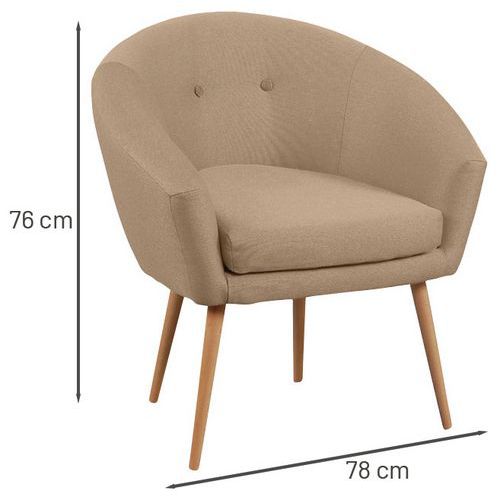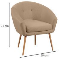 Spaanplaatstructuur, dikte l5 mm Bekleed met 100% polyester stof. Vast zitkussen, polyurethaanschuim, dikte 8 cm, dichtheid 28 kg/m3. B/H/D zitting: 46 x 46 x 46 cm. Hoogte rugleuning 35 cm. B/H/D fauteuil: 76 x 81 x 66 cm. Poten Ø 3 cm in naturel gelakt massief hout. Geleverd met pootjes die gemonteerd moeten worden. Gemaakt in de EU Klantgarantie : 3 jaar