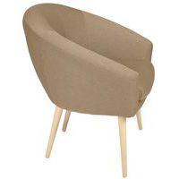Spaanplaatstructuur, dikte l5 mm Bekleed met 100% polyester stof. Vast zitkussen, polyurethaanschuim, dikte 8 cm, dichtheid 28 kg/m3. B/H/D zitting: 46 x 46 x 46 cm. Hoogte rugleuning 35 cm. B/H/D fauteuil: 76 x 81 x 66 cm. Poten Ø 3 cm in naturel gelakt massief hout. Geleverd met pootjes die gemonteerd moeten worden.
