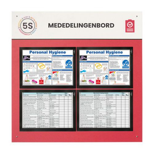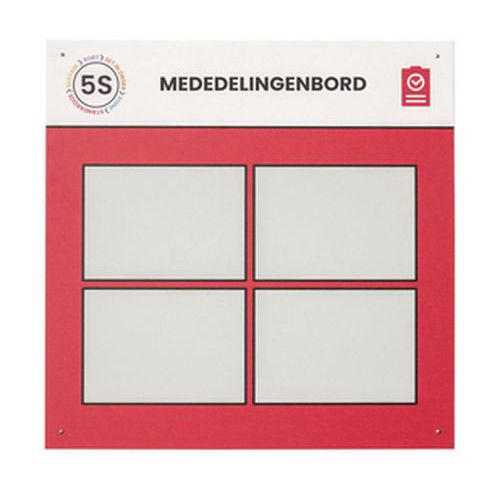 | Productnaam | Mededelingenbord 5S, Zelfklevend: nee, Stijf: ja, Norm ISO 7010: nee, Materiaal: Slagvast polystyreen |
