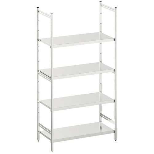Medische stelling van roestvast staal met dicht legbord van rvs. Uitstekende hygiëne: rvs 18/10, kwaliteit 1.4301. Perfecte afsluiting van de staanders met pvc afsluitdop. Modulair: hoekconfiguratie op 90° per haak, zonder juk toe te voegen. Stelling uitbreidbaar door toevoeging van aanvullende module, ook wel “aanbouwelement” genoemd. Staander met handmatig verstelbare voet van +/- 25 mm. Ideale stelling voor cleanrooms, steriliseerruimtes en operatieblokken!