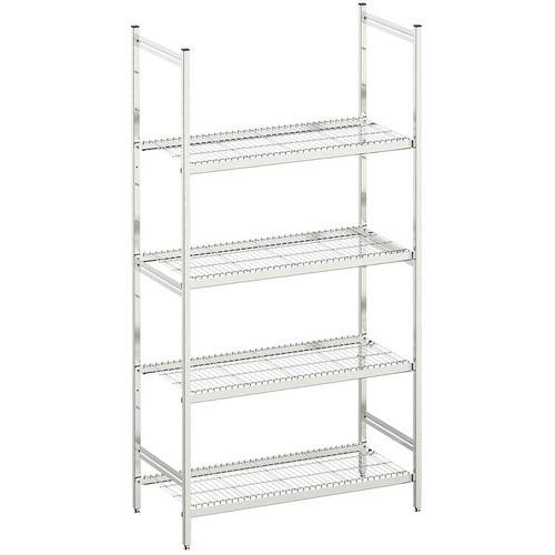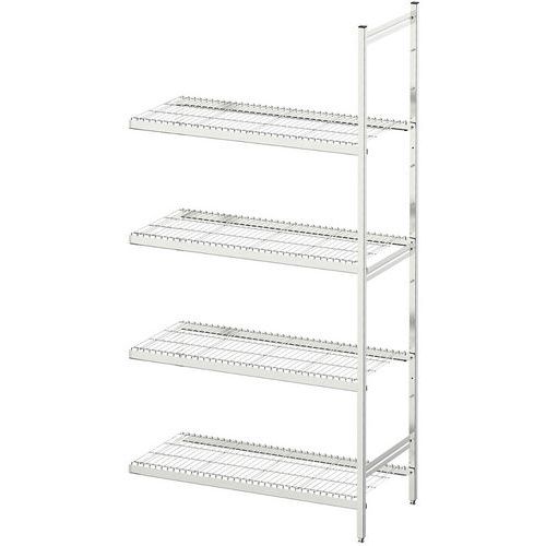 Medische stelling van rvs met draadrek van rvs. Uitstekende hygiëne: rvs 18/10, kwaliteit 1.4301. Perfecte afsluiting van de staanders met pvc afsluitdop. Modulair: hoekconfiguratie op 90° per haak, zonder juk toe te voegen. Stelling uitbreidbaar door toevoeging van aanvullende module, ook wel “aanbouwelement” genoemd. Staander met handmatig verstelbare voet van +/- 25 mm. Ideale stelling voor cleanrooms, steriliseerruimtes en operatieblokken! Ideaal voor was- en conditioneringsruimtes, boven gootstenen en tafels!