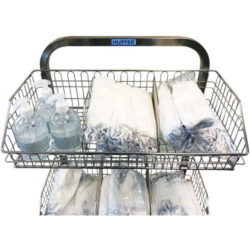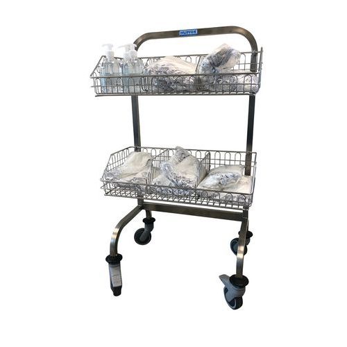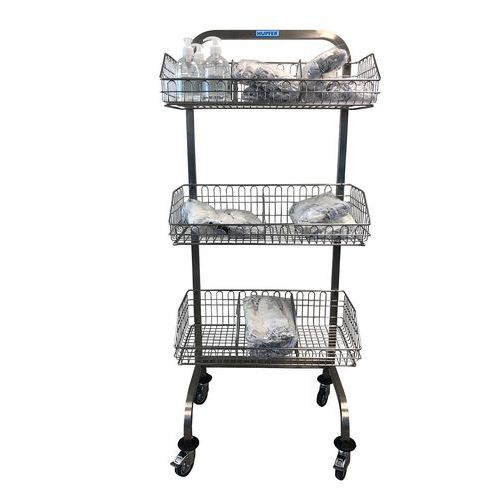 Medische wagen volledig van hoogwaardig roestvast staal, stevige en hygiënische constructie uit één deel. Met 2, 3 of 4 RVS manden voor transport, opslag en distributie van steriele producten in soepele verpakkingen. Eenvoudig te onderhouden met kraanwater en een ontvettend reinigingsmiddel of een reiniger voor roestvast staal. Met 4 schokbestendige zwenkwielen waarvan 2 met rem. Voldoet aan de gezondheidsvoorschriften in verband met Covid-19 dankzij de uitvoering van rvs, dat onder andere bekend staat om zijn hygiënische eigenschappen. De wagen voldoet aan de veiligheidsaanbevelingen voor gezondheid