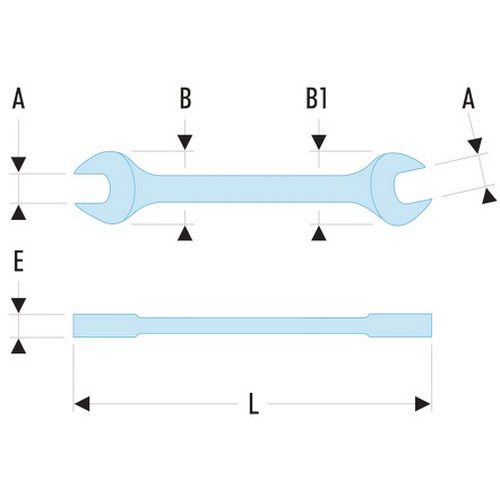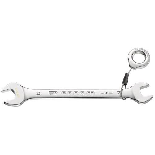 Gereedschap, uitgerust met een handige FACOM SLS bevestigingsoplossing die elk risico op een accidentele val voorkomt. De glijdende kabel-oplossing, geselecteerd en getest door FACOM, behoudt de gebruiksergonomie van het gereedschap (8-30 mm sleutels). Steeksleutels = de vorken zijn platter dan van een standaard ringsteeksleutel en komen daarom op plaatsen waar dikkere sleutels niet kunnen komen. Voorbeelden: remklauwen, contramoeren van hydraulische slangen. 15° gebogen koppen. Metrische maten: van 6 tot 41 mm. Uitvoering: verchroomd, gesatineerd.