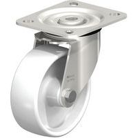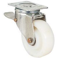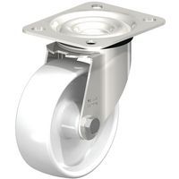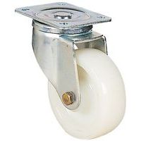 - Zwenkwiel met nylon velg en polyurethaan loopvlak met verzinkt stalen gaffel, bestand tegen oliën en vetten.