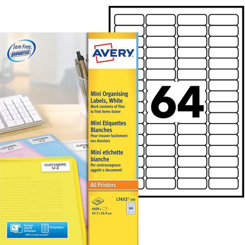 Mini-etiket Avery, Aantal etiketten/vel: 64, Aantal etiketten: 6400, Lengte etiket: 45.7 mm Mini-etiket Avery, Aantal etiketten/vel: 64, Aantal etiketten: 6400, Lengte etiket: 45.7 mm